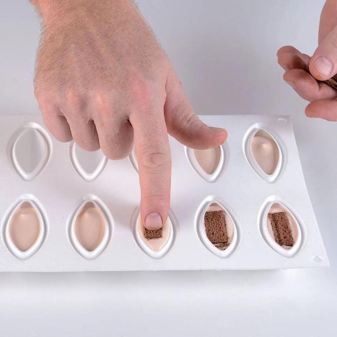 Silikomart Professional presents a new, elegant shape perfect to create 3D sweet or savory quenelle. This mold is conceived and made with maximum care combining beauty and handiness. The new shape is provided with a special and innovative border in the upper part which gives a particular round shape to the base of pastries. This new technology and the flexibility of the high quality guarantee an easy and perfect unmold in every single detail, ensuring perfect results and total fidelity to the shape. An inevitable tool in every laboratory, QUENELLE is resistant to temperature ranges between -60°C (-76°F) and +230°C (+446°F), therefore it is suitable for semifreddos but also for ice cream and baked creations .