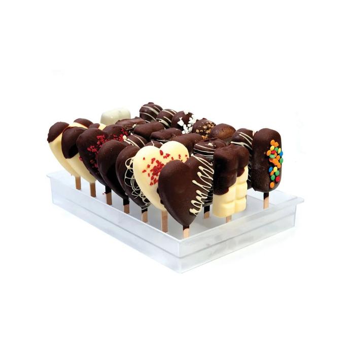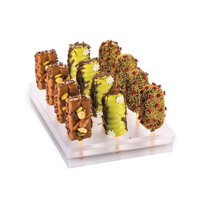 Espogel Up, is the new and original ice cream display, made of polystyrene and available in 4 colors (transparent, orange, green and fuchsia), proposed by Silikomart Professional to present upwards ice creams on a stick and ice cream sandwiches. Very functional, it takes the space of a standard ice-cream container. Ideal for the whole Steccoflex line, it has been designed to get along also with all universal wood sticks (big size).